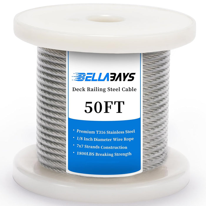 1/8" T316 50ft Stainless Steel Cable Non-Magnetic Aircraft Cable 7x7 Strands for Deck Railing Wire Rope Stair Railing Handrail DIY Balustrade