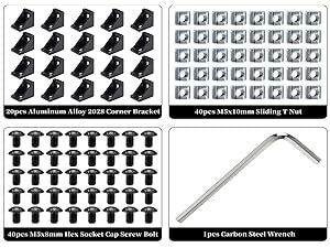 20 Sets 2028 Corner Bracket Connector Set Black for 20 Series Aluminum Extrusion Profile with 40pcs M5x10mm T Nut 40pcs M5x8mm Screw Bolt 1pcs Wrench Aluminum Rail 3D Printer Accessories