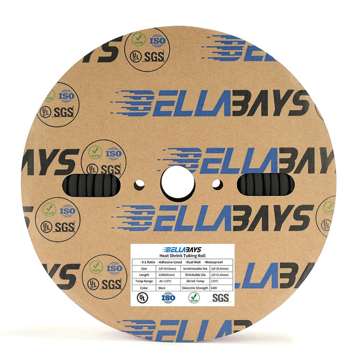 3:1 Ratio 3/8 Inch (9.52mm) 120 Ft (36.5m) Black Heat Shrink Tubing Roll Adhesive Lined Tube, Waterproof Marine Grade, Insulation Sealing and Oil-Proof (UL,RoHS,SGS,ISO Certification)