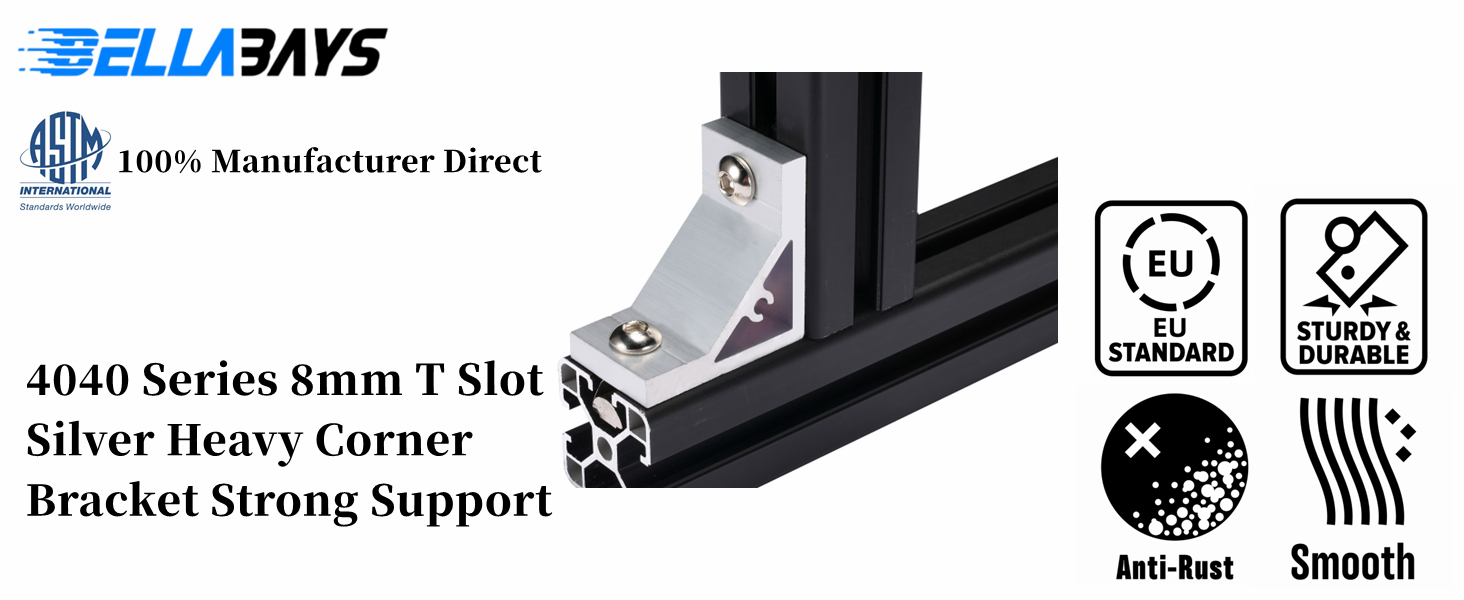 The heavy corner bracket set paired with 4040 series 8mm T slot aluminum extrusion, widely used in various fields such as 3D printing, fitness equipment, home decoration, architectural structure, automation facility, automotive modification, transportation, electronic devices, and aerospace etc.